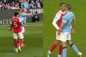 第83分鐘,加布里埃爾與哈蘭德爭搶高空球將他壓倒,哈蘭德起身推了一把加布里埃爾,隨后兩人頂牛,期間加布里埃爾發力頂向哈蘭德,羅德里再次第一時間沖上來為哈蘭德出頭,與加布里埃爾頂牛??